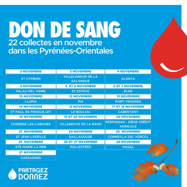 La Maison du don de Perpignan (située derrière l’Hôpital) est également ouverte du lundi au vendredi + samedi 8 et 22 novembre > Don de sang, plasma et plaquettes.