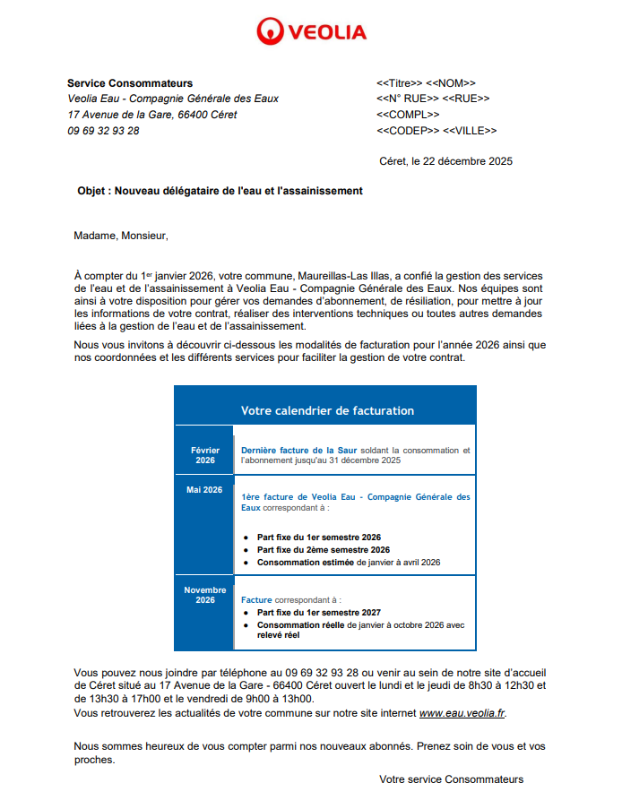 Pour votre information, un courrier vous sera adressé très prochainement par la société VEOLIA EAU.