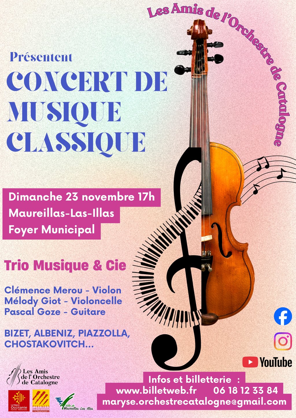 L’association Les Amis de l’Orchestre de Catalogne présente le Trio Musique & Cie en concert le dimanche 23 novembre à 17h , Foyer Municipal de Maureillas-las-Illas.